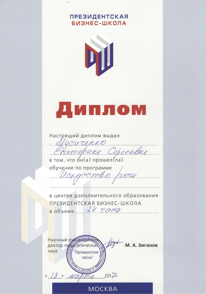 Окончила МГУ им. М.В. Ломоносова по специальности «Перевод и переводоведение», сертифицирована Кембриджским университетом (CELTA, Коммуникативный метод, Advanced Methodology, Teaching Young Learners and Teenagers, Teaching One-to-One). Обучалась по программам «Оптимизация подготовки к сдаче ОГЭ и ЕГЭ», «Психологическая подготовка учащихся к экзамену», «Онлайн-преподавание иностранных языков», «Нейродидактика в обучении иностранным языкам». Владею основами актёрского мастерства.